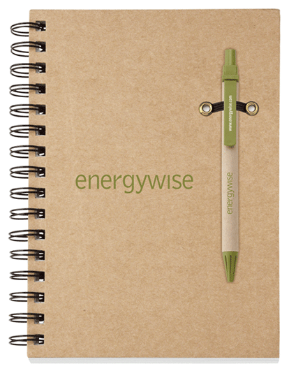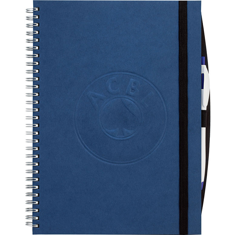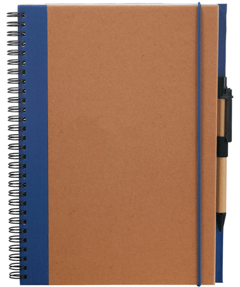 Features : Eco recycled journal with pen combo. Ballpoint pen is made out of recycled paper and corn starch. Journal is made out of cardboard with double spiral binding, elastic pen loop on cover and 80 white lined sheets. 70% recycled hard cover and 50% recycled interior.