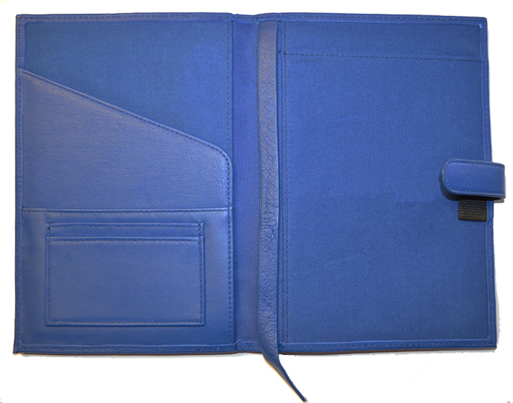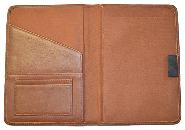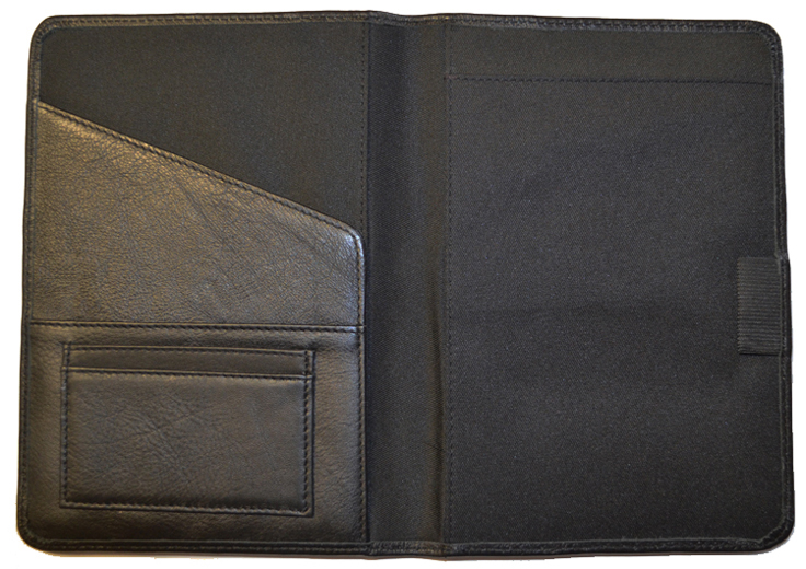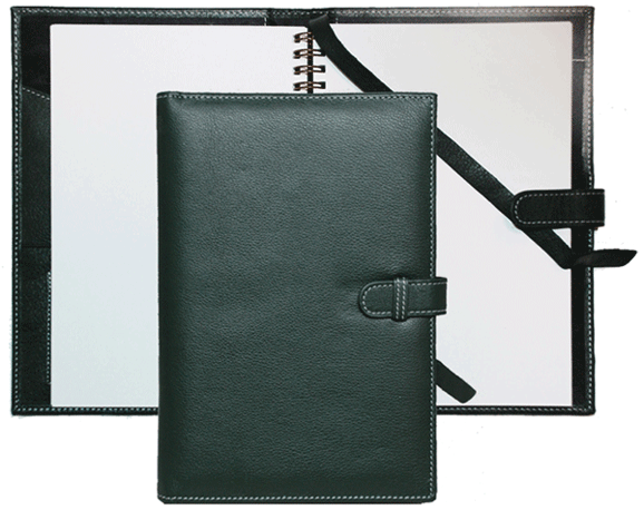 Features : Completely hand stitched and turned edges, with a foam-padded genuine leather cover, many interior pockets, and a pen loop. Ten business-card-size pockets on the left side, plus a document flap. Holds an 8 1/2" x 11" notebook or letter-size pad, with both vertical and horizontal slots on the right side. A 160-page lined spiral journal is included.