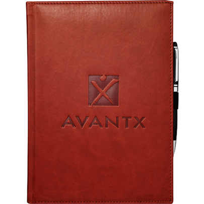 Features : NeoSkinĀ® hardcover wirebound journal with decorative stitching, an elastic pen loop on the cover, three interior card slots and a large interior pocket. 96 perforated ivory ruled sheets and a matching plastic push-action ballpoint pen.
