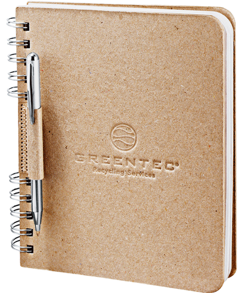 Features : Eco recycled journal with pen combo. Ballpoint pen is made out of recycled paper and corn starch. Journal is made out of cardboard with double spiral binding, elastic pen loop on cover and 80 white lined sheets. 70% recycled hard cover and 50% recycled interior.