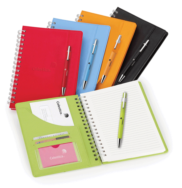 Features : NeoSkinĀ® hardcover spiral-bound journal with decorative stitching, an elastic pen loop on the cover, three interior card slots and a large interior pocket. 96 perforated ivory ruled sheets and a matching plastic push-action ballpoint pen.